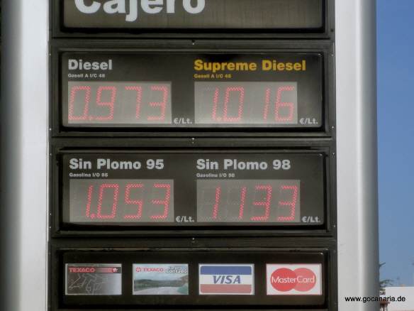 Der Liter Benzin kostet ab 1.053 Euro und der Liter Diesl ab 0.973 Euro, damit hat Gran Canaria die tiesten Treibstoffpreise in der Eurpäischen Union.