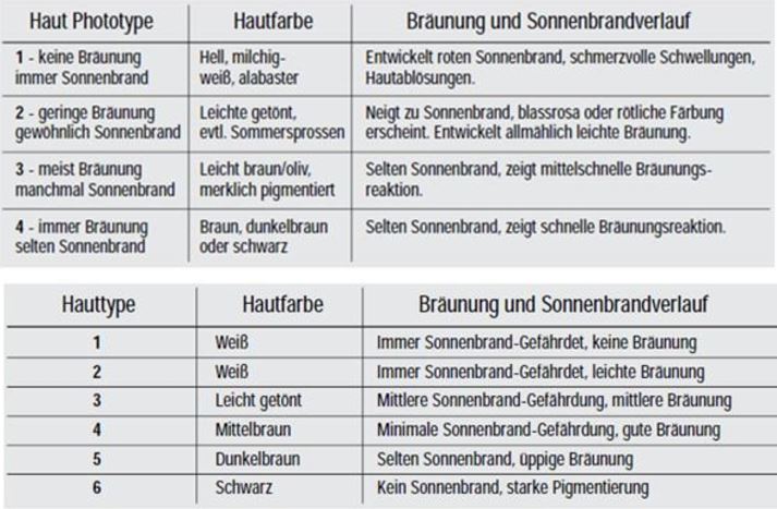 Die folgende Tabelle wurde von T.B. Fitzpatrick von der Medical Harvard School entwickelt. Sie beinhaltet eine Klassifizierung der Hauttypen in 6 Stufen. Diese Einstufung wird übrigens auch von den strengen kanadischen Umweltschutzbedingungen adaptiert.