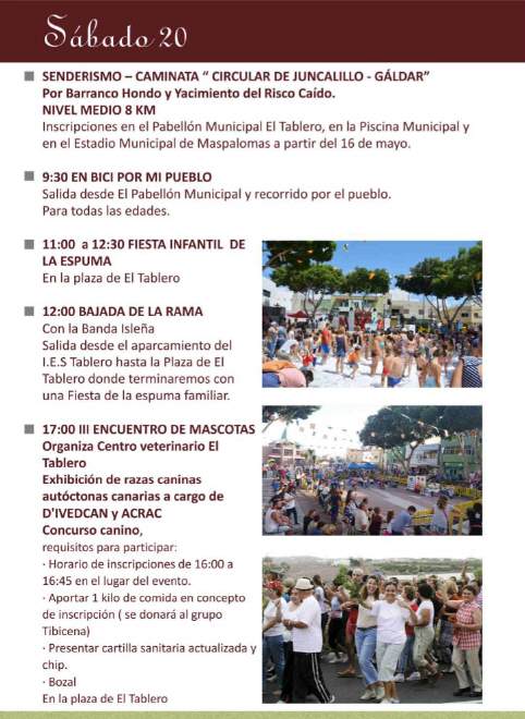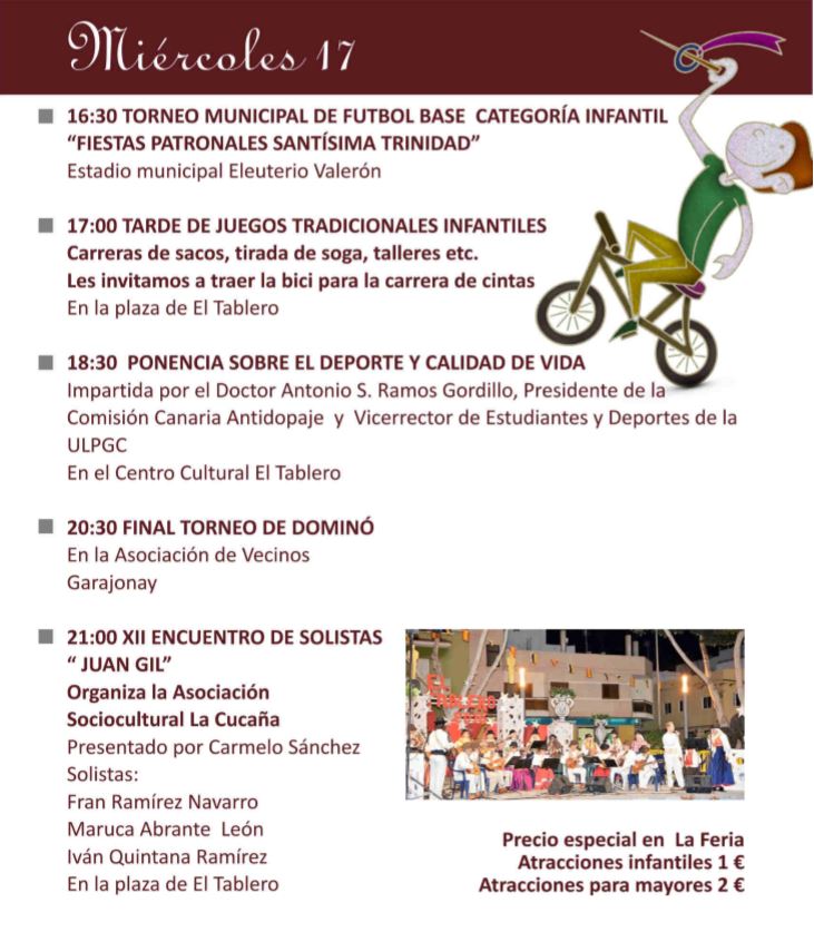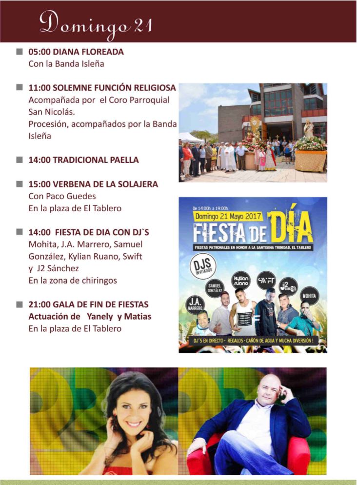 Am Donnerstag den 11. Mai 2017, beginnen die traditionellen Dreifaltigkeits-Fiestas in El Tablero de Maspalomas. Einer der Höhepunkte ist die Romería am Samstagabend den 13. Mai, eine Art Erntedankumzug mit Pilgern und viel natürliche Folklore.